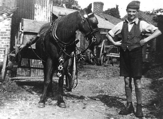 Edgar Wood (born 1918) with the horse "Nelson" and cart housed at Slaters yard. He is carting ash away from the stationary steam engine which drove all the machinery. The engine was fired on wood waste from the works.