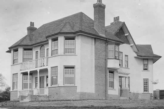 A modern brick porch has replaced the ornate woodwork seen in this 1917 photograph.