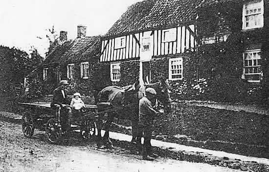 The tenants of the Inn were Mr and Mrs Cass and John Taylor. Horse and wagon owned by Mr Tom Colling with his son Henry and grandson Edgar Wood.