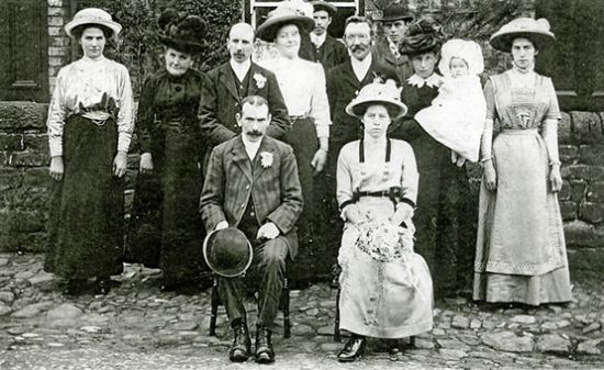 Martha Slater (daughter of Elizabeth and Tom Slater, 1879-1950) and Ernest Ayre (1884-1946) wedding group outside Hazledene 1909
