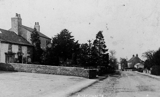 It shows the house on the Green, the Black Bull and Holly House. It looks up the Nookin Bank to Clarence House on the left.